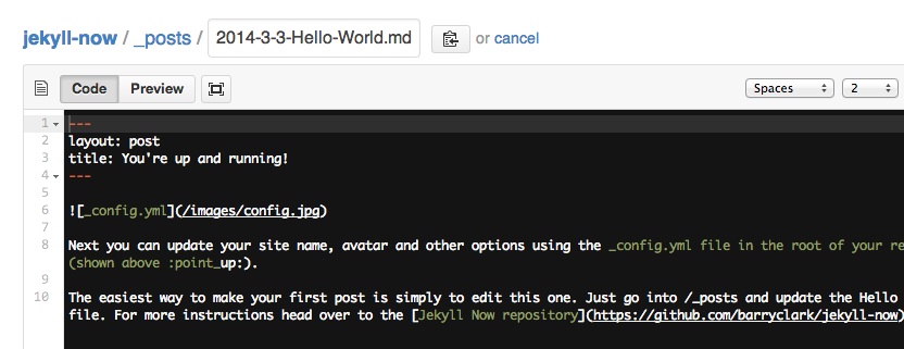 Navigate to the posts folder in the root of this repository and edit /_posts/2014-3-3-Hello-World.md to publish your first blog post. This Markdown Cheatsheet might come in handy.